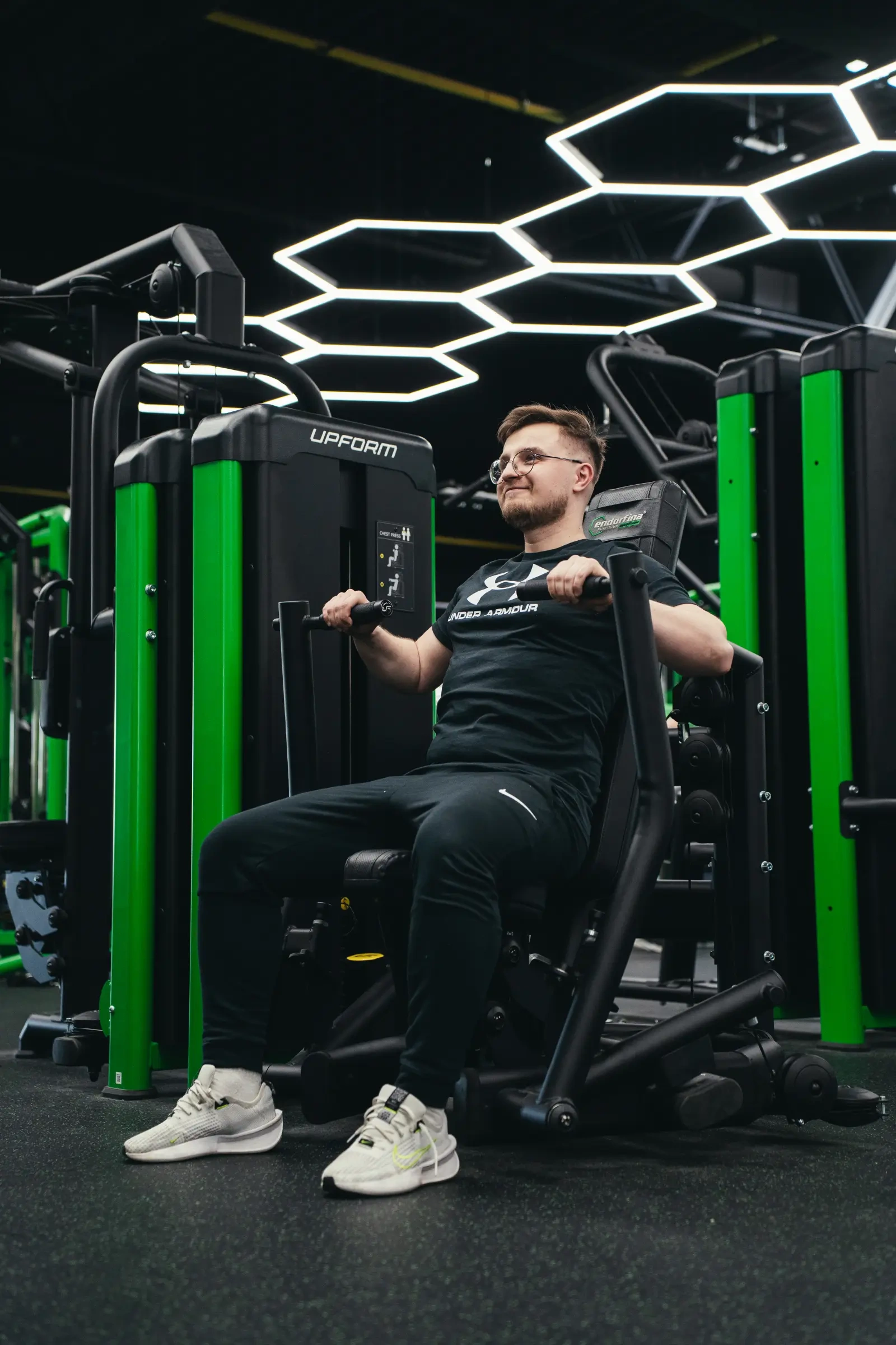 La máquina permite entrenar los músculos pectorales, los hombros y los tríceps en posición sentada. La amplitud de movimiento en el plano horizontal está limitada y "controlada" por el diseño de la máquina. La estabilización y el control completos permiten el entrenamiento aislado de los grupos musculares deseados, facilitan el desarrollo de la técnica correcta y minimizan el riesgo de lesiones. El uso de la máquina UR-U029 2.0 garantiza un entrenamiento seguro y eficaz.