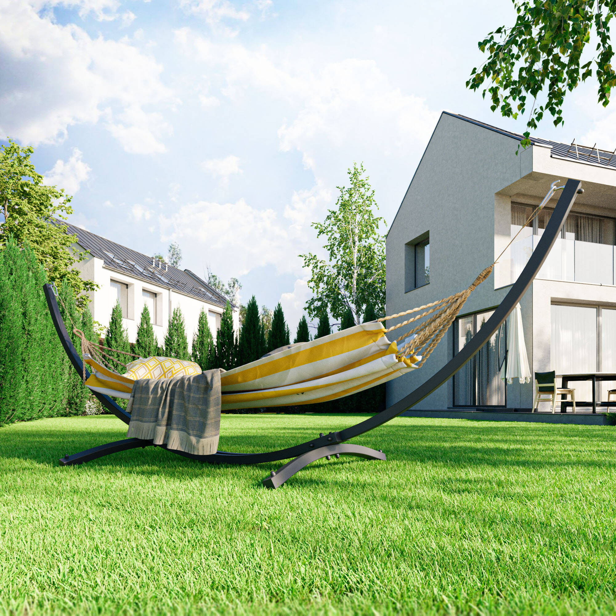 La distancia entre los ganchos de sujeción es de hasta 344 cm, lo que garantiza un alto nivel de comodidad incluso con hamacas familiares grandes.