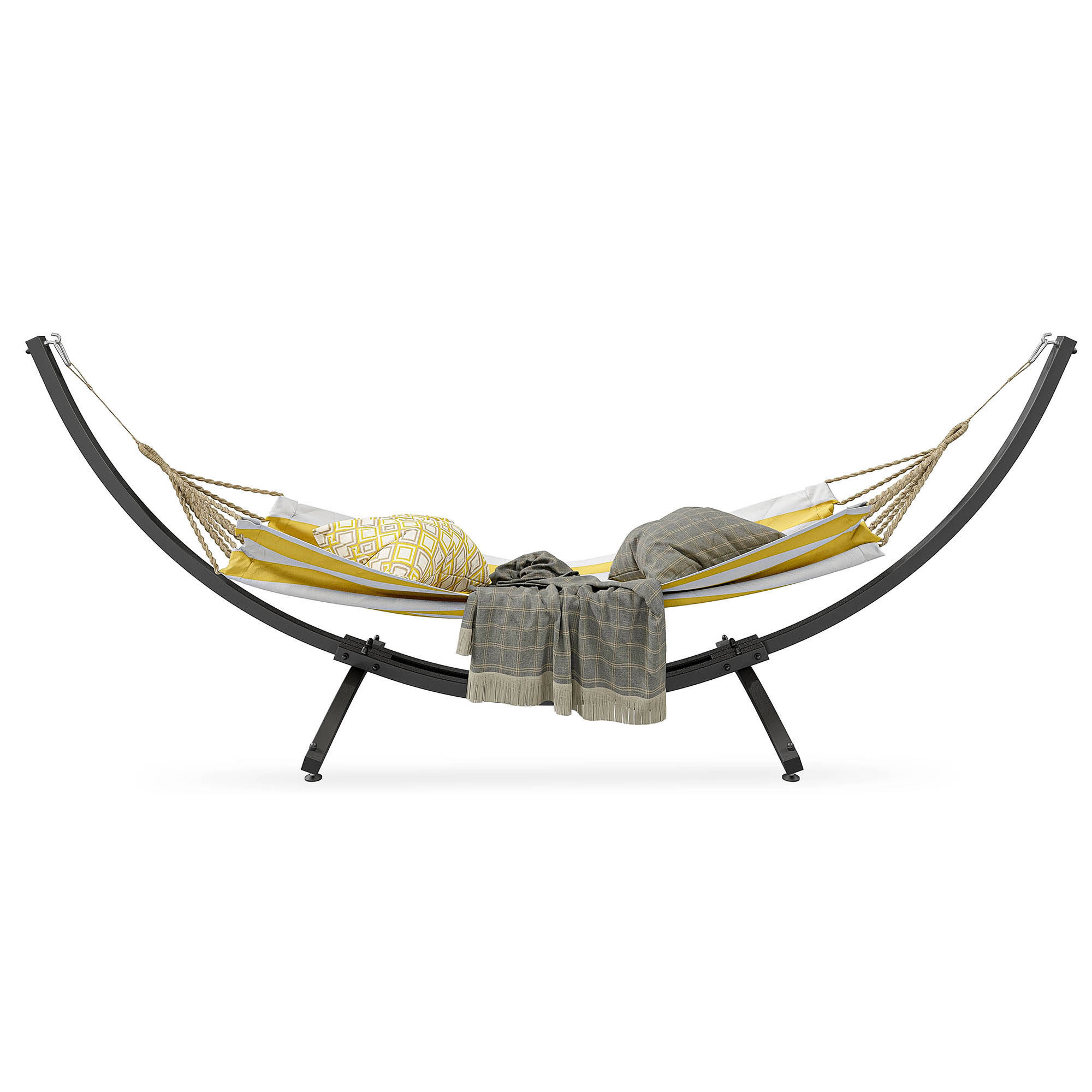 Los robustos ganchos de sujeción de acero inoxidable facilitan la fijación y la separación de la hamaca del armazón, lo que resulta especialmente práctico, por ejemplo, cuando llueve.
