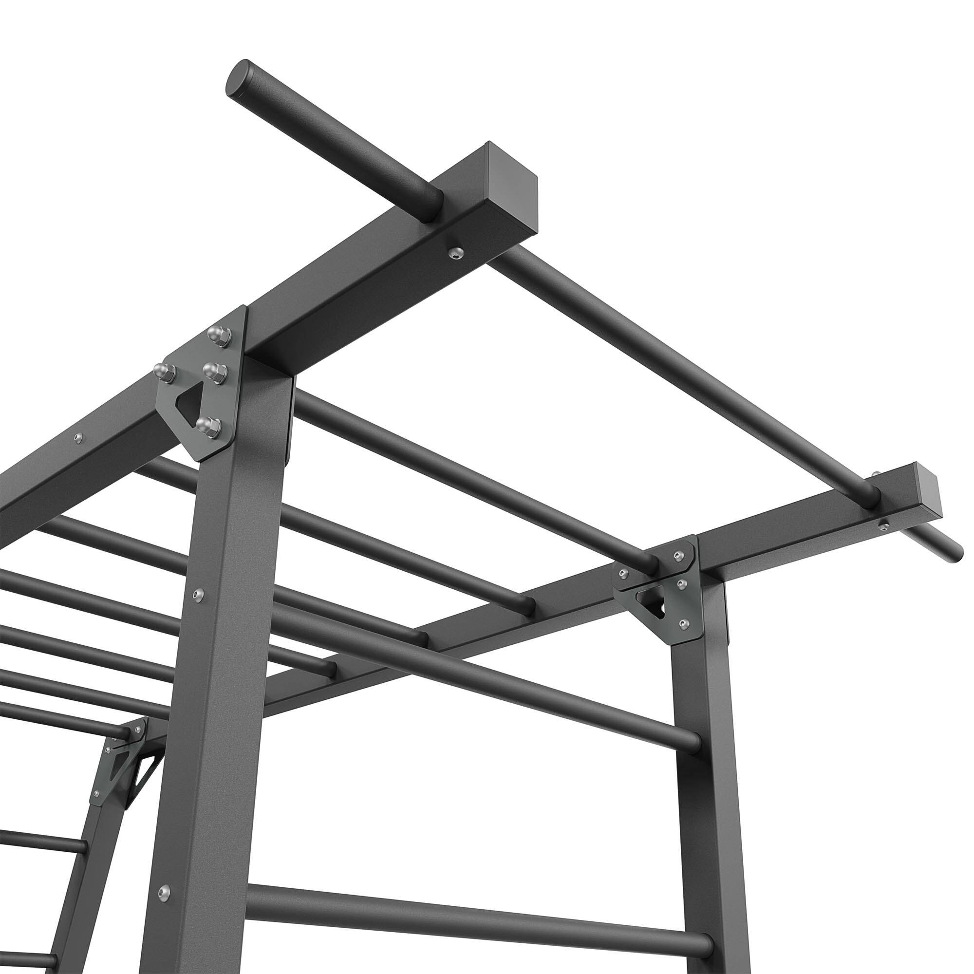 Además, uno de los peldaños de la sección horizontal se ha prolongado más allá del contorno de la escalera, lo que crea una barra para dominadas ajustadas y amplias.