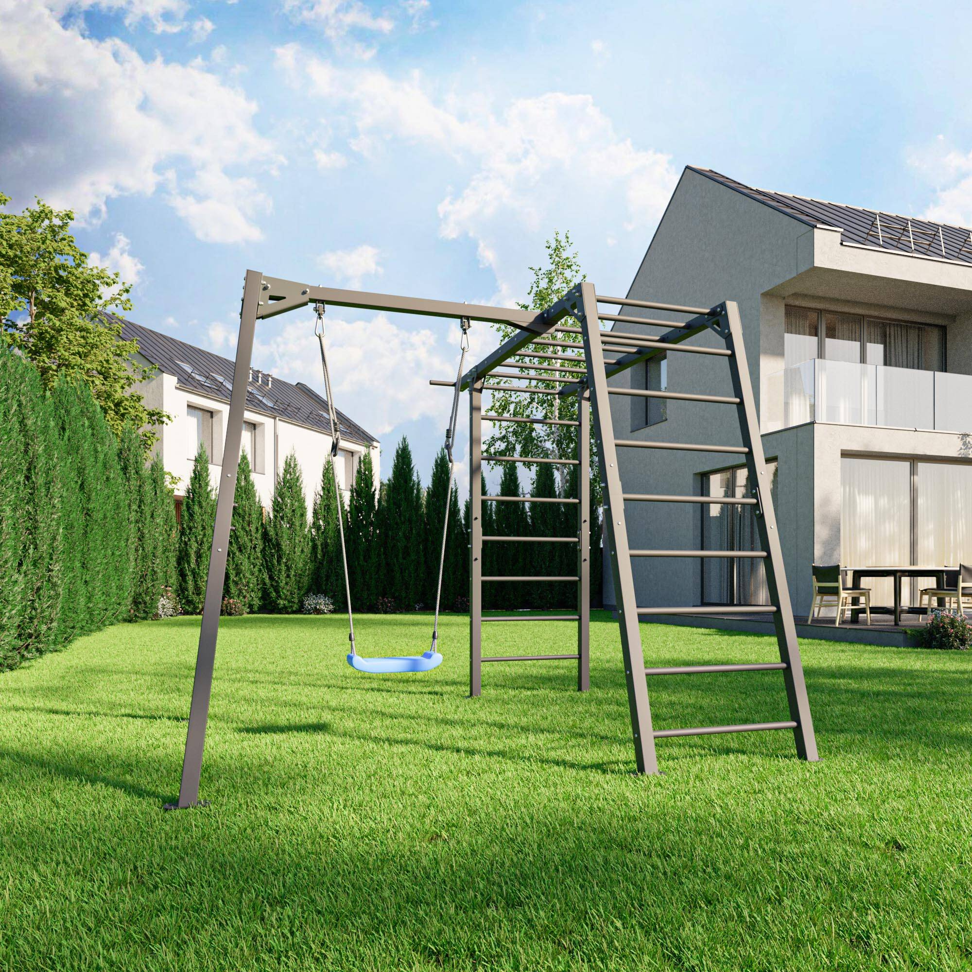 El armazón del columpio permite colgar una gran variedad de accesorios adecuados tanto para la diversión durante el recreo como para el entrenamiento deportivo. Dejamos la selección del producto colgante en manos del cliente para que pueda elegir el modelo, la forma y el color que satisfagan sus expectativas individuales.